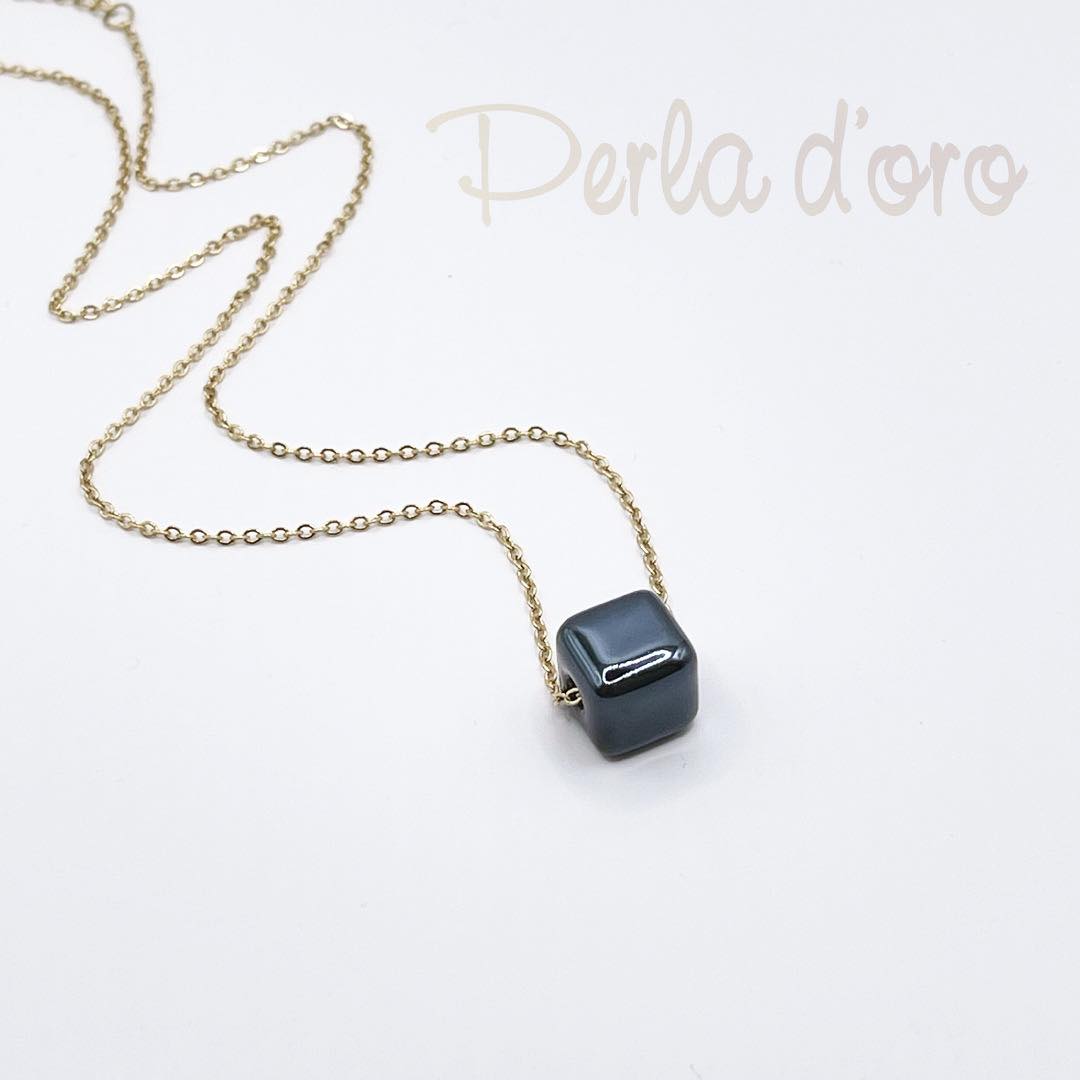 Golden steel necklace dark blue cube