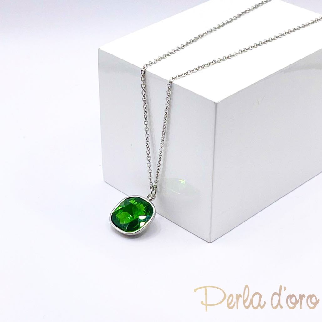 Silver steel necklace with green crystal stone