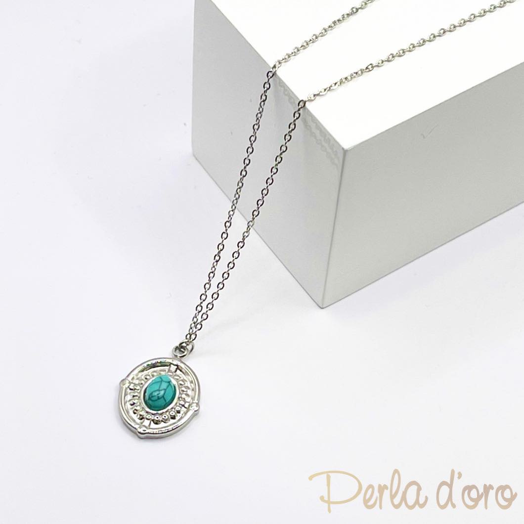 Αρχική σελίδα / Κοσμήματα / Κολιέ / Κολιέ ατσάλινο ανάγλυφο ασημί με γαλάζια πέτρα